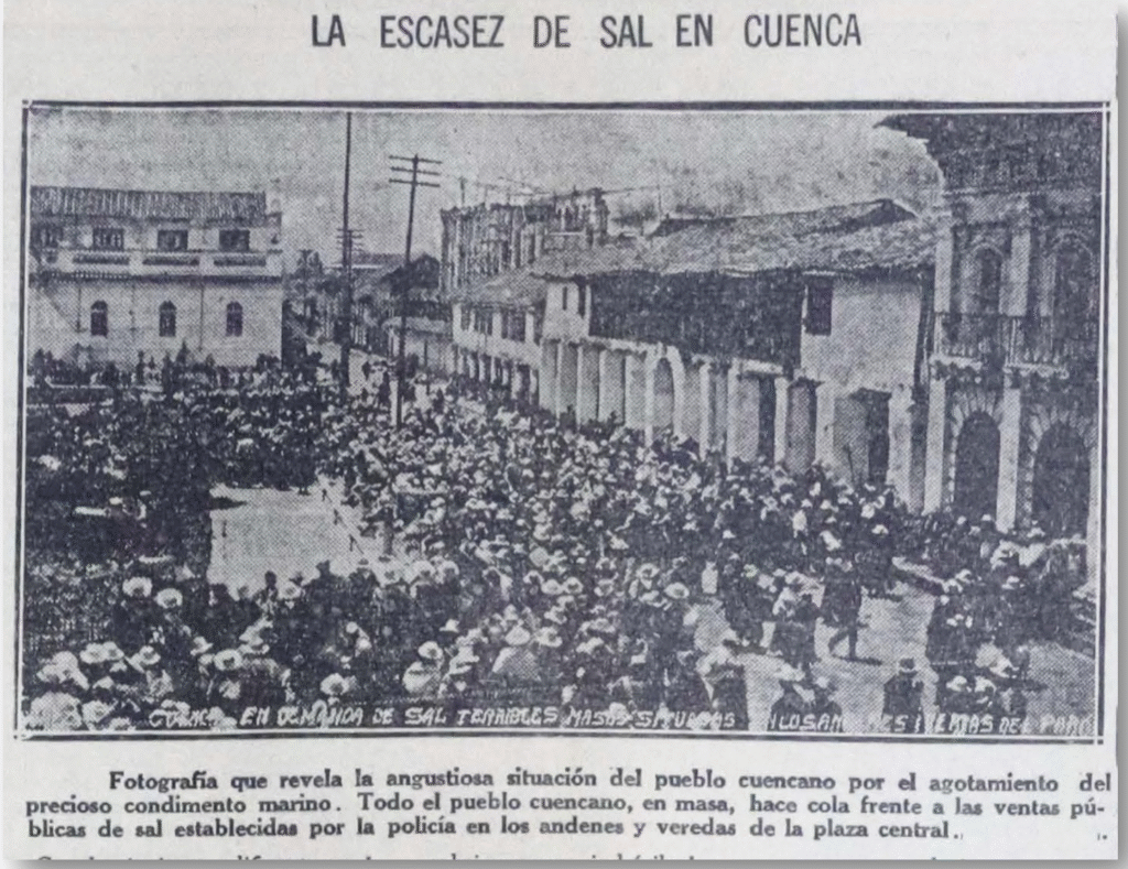 Durante varios días no hay información sobre Cuenca. El daño de la línea telegráfica causó incomunicación entre el corresponsal de Cuenca y el de Guayaquil. El corresponsal indica que, diariamente hay muchedumbres en los “portales de la gobernación” para que la gente acceda a unas boletas que les permita comprar sal en establecimientos. Esta cuestión particular de Cuenca tuvo relación con la situación nacional de la escasez de víveres como el carbón, el arroz, el café, el azúcar (El Telégrafo, 1925, pág. 1); el juzgamiento a los comerciantes que exageran los precios de los víveres y la policía es quien se hace cargo de esta problemática comercial (El Telégrafo, 1925, pág. 8). Se sugiere que el Ejecutivo tome medidas, pero varios ministros han renunciado y el gobierno del presidente Gonzalo Córdova tambalea (El Telégrafo, 1925, pág. 1). Es la antesala de la Revolución Juliana.